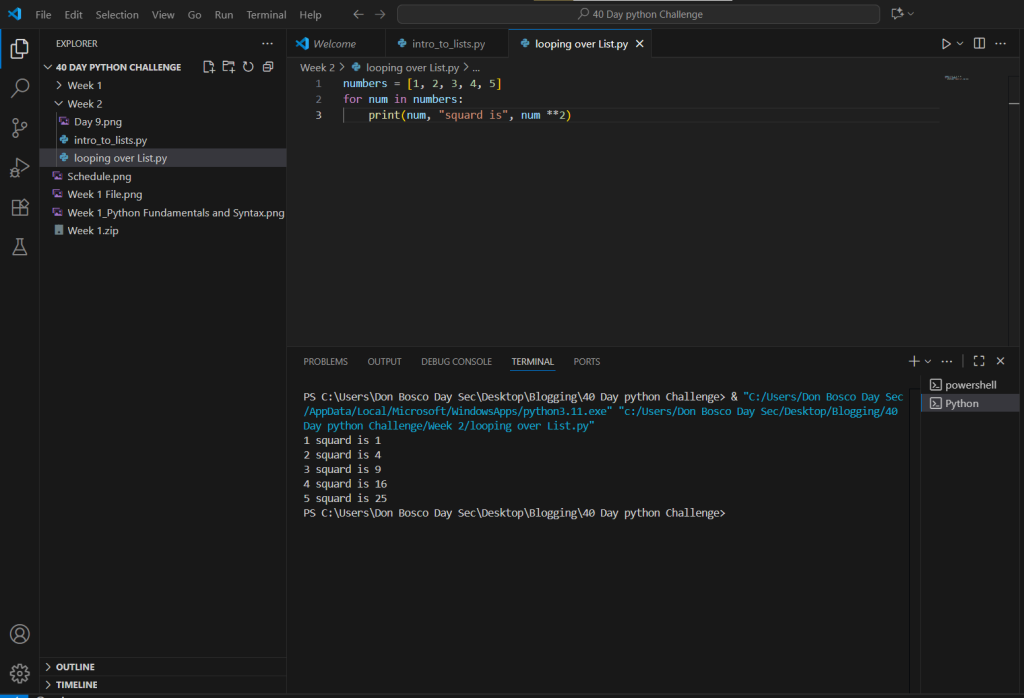 Run: Prints "1 squared is 1", "2 squared is 4", up to 5. Simple! In 10-15 min, change the list to strings (e.g., names) and loop to print lengths (len(num)). This shows loops aren't just for numbers—great for processing data sets. You're automating repetition over collections now!